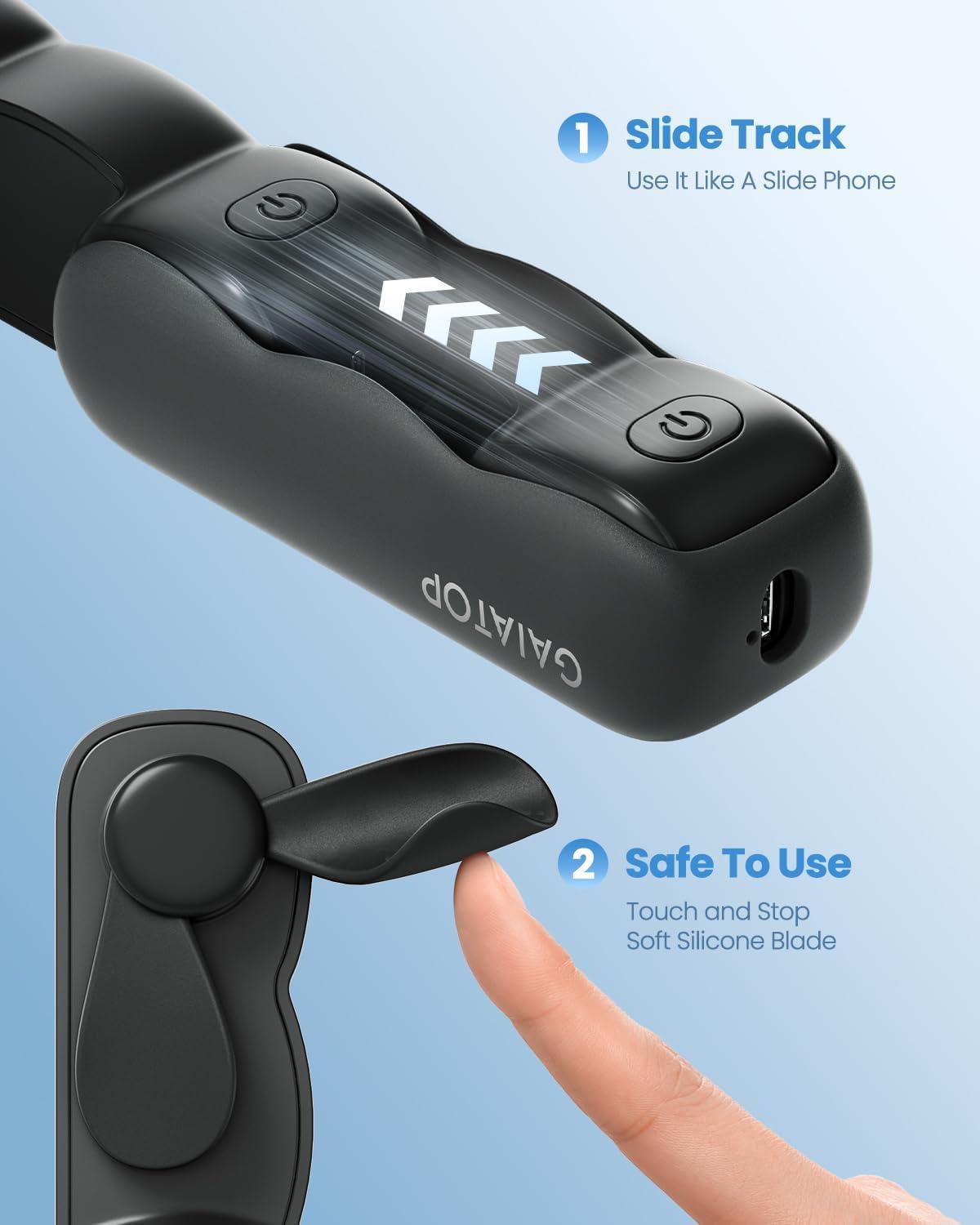 Touch And Stop, Safer For Use: Soft fan blades stop once you touch them and they do not hurt you at all; You will need to press the button to turn the small fan back on; The blades are flexible and made of soft TPU, and will not hurt your hands or hair