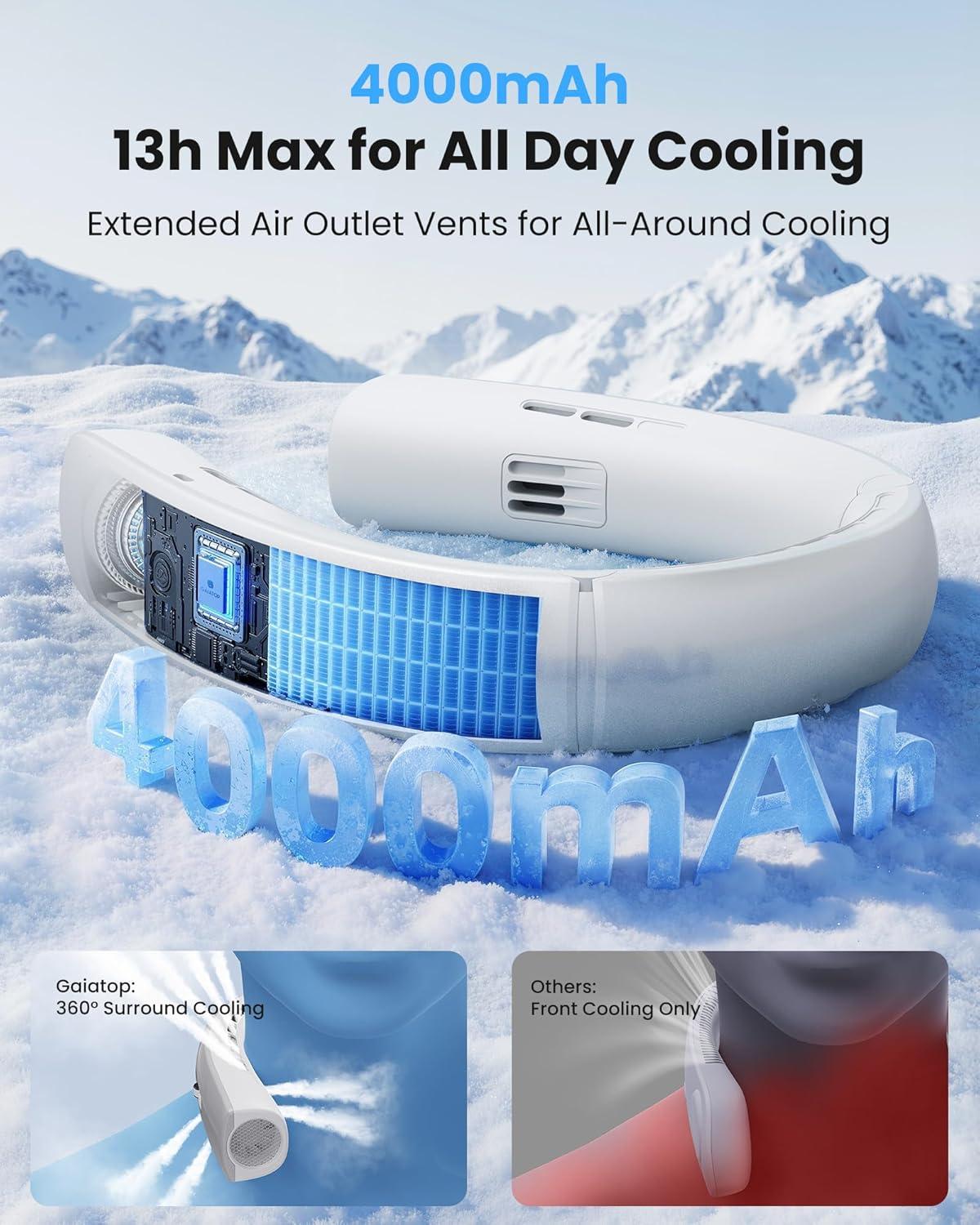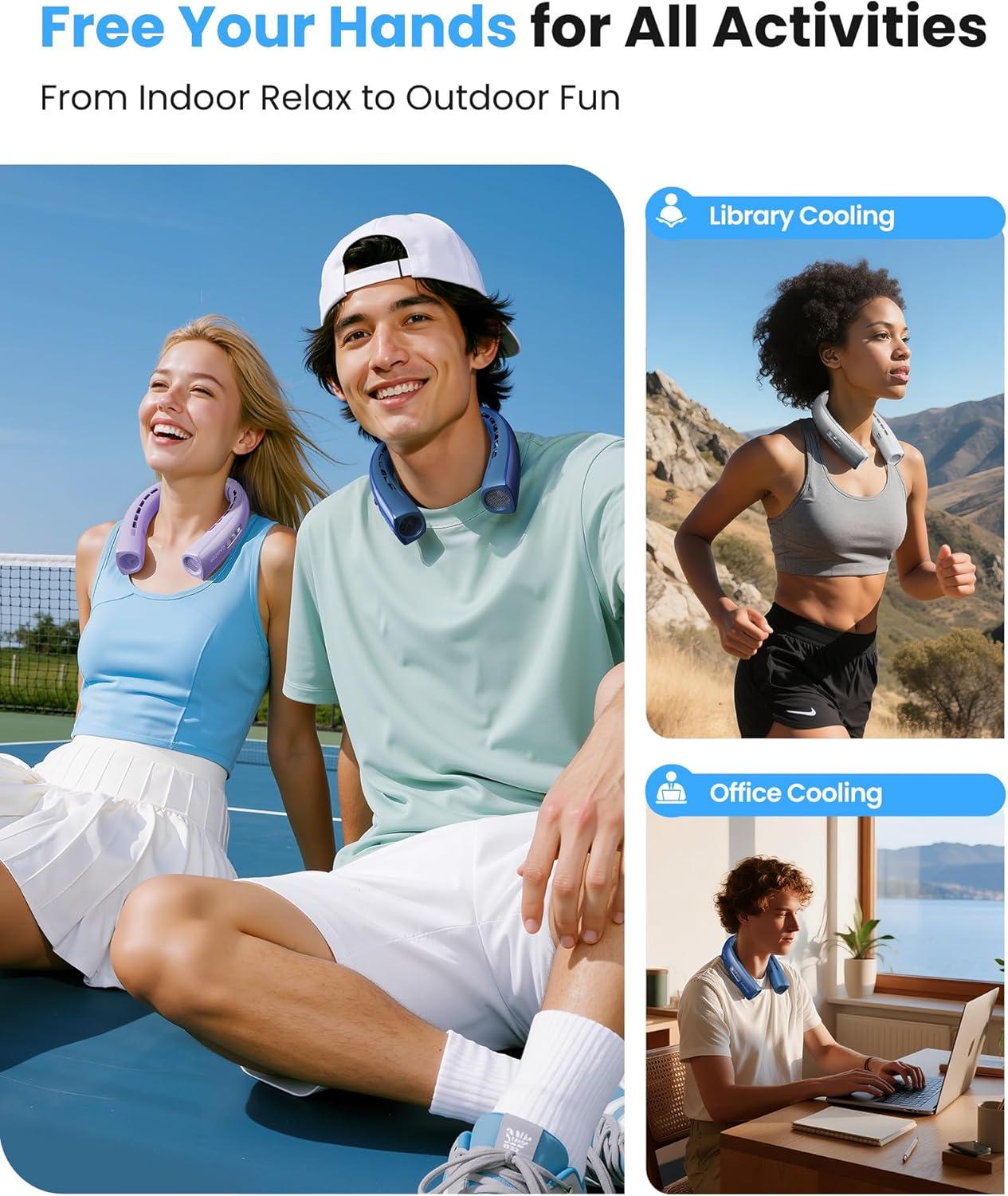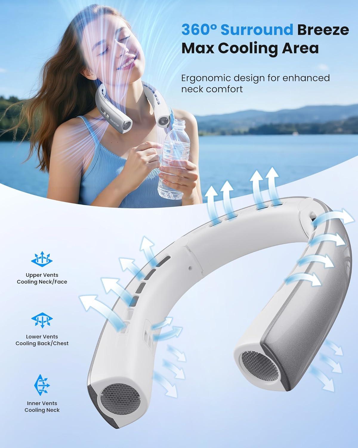 360° Wide Area Surrounding Airflow to Cool: This is an upgraded ergonomic neck fan that blows cold air, features 16 upper extended vents (cooling neck/face) + 4 lower enlarge vents (cooling back/chest) + 4 inner wide vents (cooling neck), covers 360° ultra-wide cooling area, enjoying consistent airflow from all angles. With innovative 2 turbo motor fans and patented airflow compression technology, using spiral blade system, boosting cooling efficiency by 70%, powerful nexk fan for outdoor activities or indoor relaxation