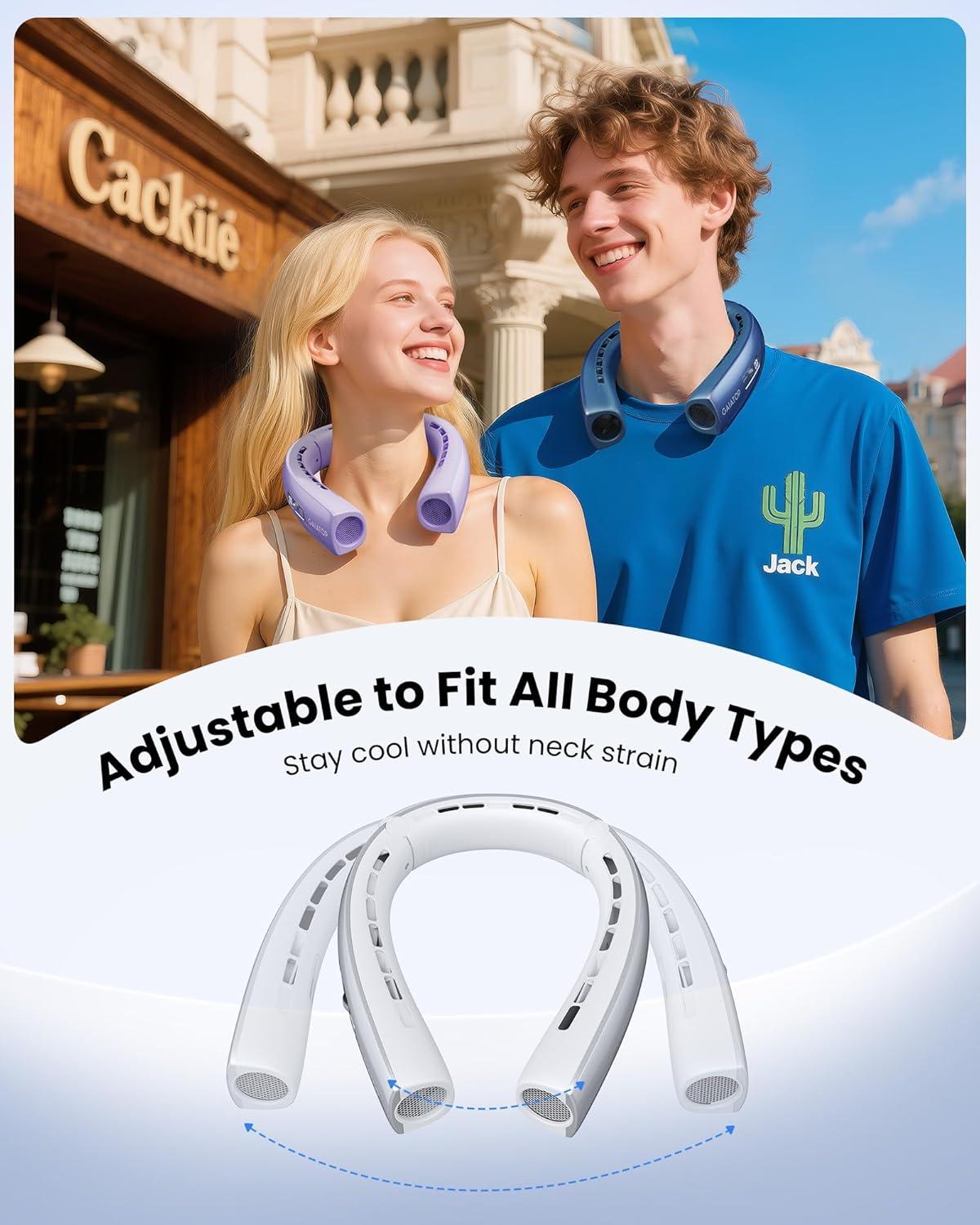 40° Stretch Hands-Free Summer Companion: This portable fan with ergonomic design completely frees your hands and stays cool with a perfectly curved for the position of the neck. 20° adjustable on both arms, designed for wear freedom, suitable for any age and figure of people, not easy to fall off, making you wear it with comfortale during trips, and sports. Adopts a scroll switch design, convenient to adjust wind from 1 to 100. Keeping you cool in commute, party, sports, hiking, etc