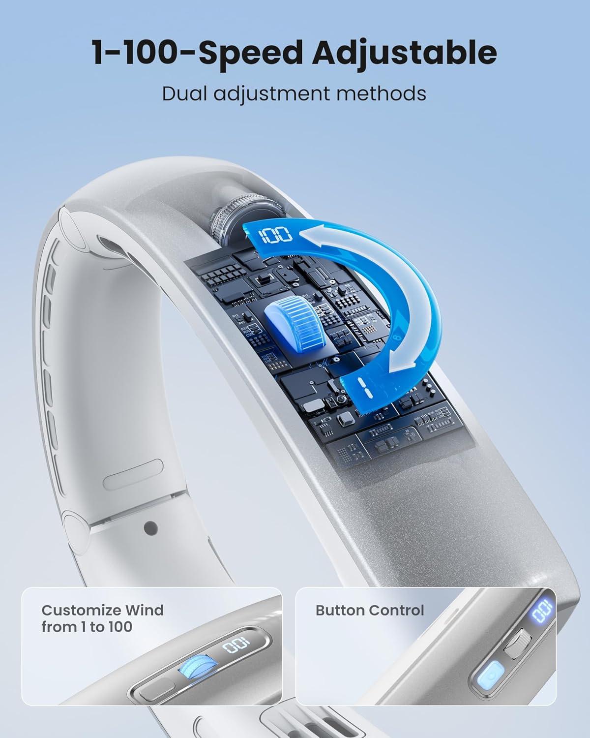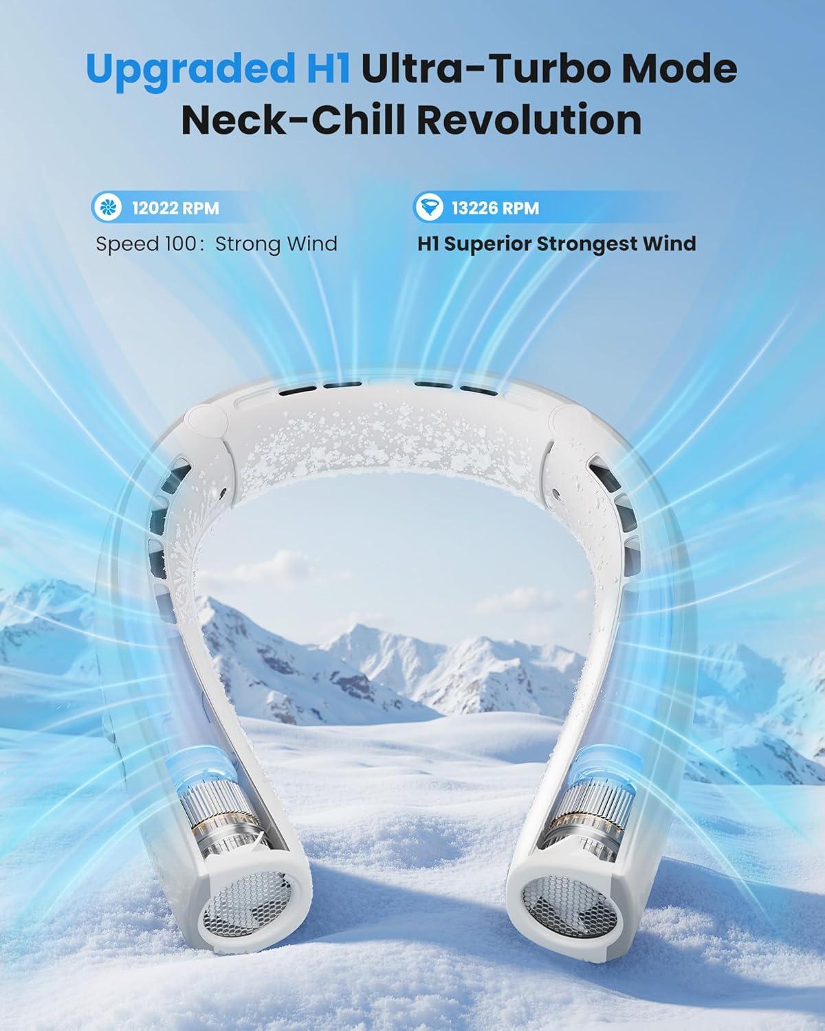 Next-Gen H1 Turbo Mode & 1-100 Scroll Switch: Our personal neck coolers featuring a dual-function wind adjustment system with independent controls, 6 speeds from soothing-soft airflow (1-5 speeds) to H1 superior strong wind (double press to H1 mode at any speed, to activate high-speed ultimate strongest wind); Customized wind by scroll switch from 1 to 100 adjusted, delivering personalized comfort with efficient cooling while working, traveling, camping, at school, gym, or in the office