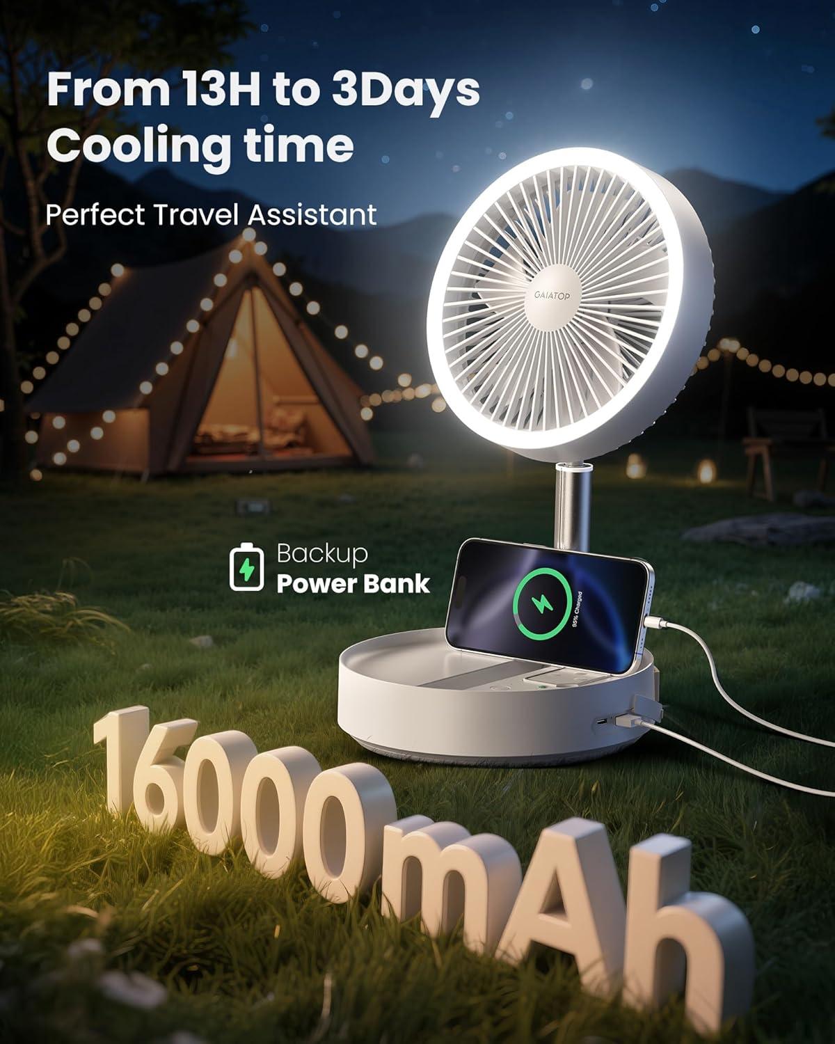 Gaiatop Portable Pedestal Fan 16000mAh Battery [Max 74h Runtime], Foldable Oscillating Standing Fan, Collapsible Desk Fans, LED Light, Case & Remote Control, 4 Speeds for Outdoor Travel Camping Office(White)