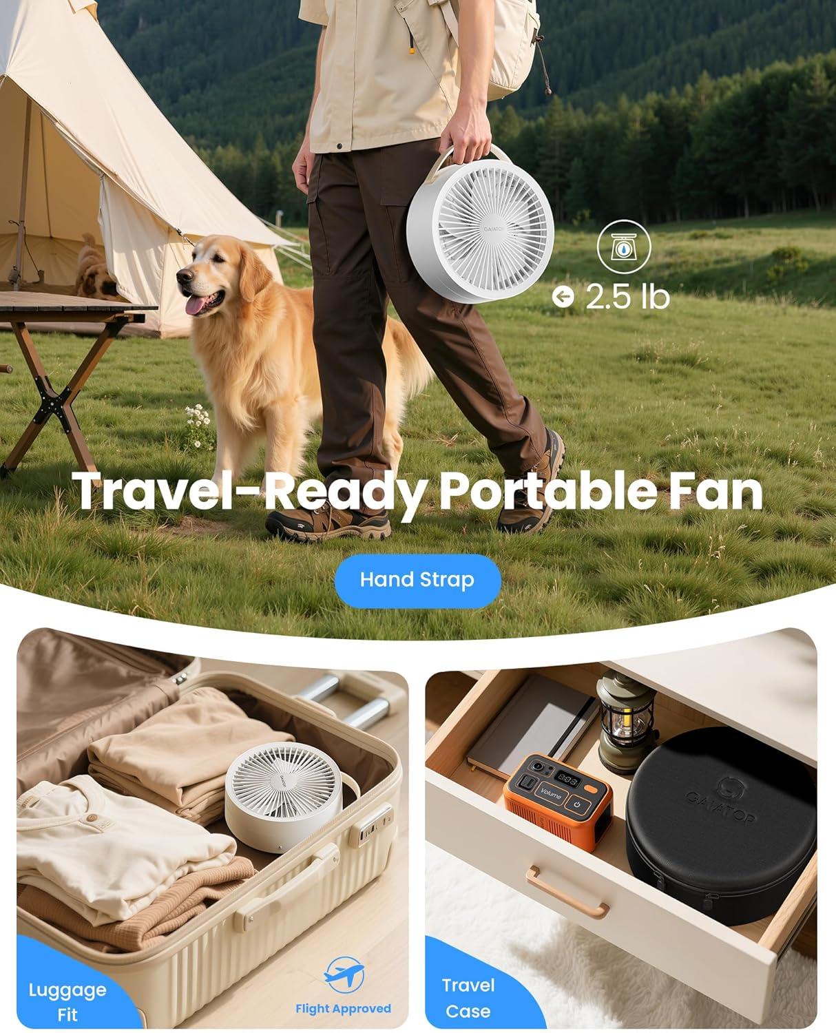 Perfect Travel Buddy to Refresh Your Trip: The foldable desk fan with small size, weights only 2.5lb and folds to an compact size of only 4*8*8in, will easily fit into your bag or backpack, makes it the greatest cooling experience for traveling and outdoors. Designed with a leather handle strap and carry-on case, it offers both style and functionality, easy to carry for outdoor activities like fishing, travel, cruise ship, backyard, balconies, and tent
