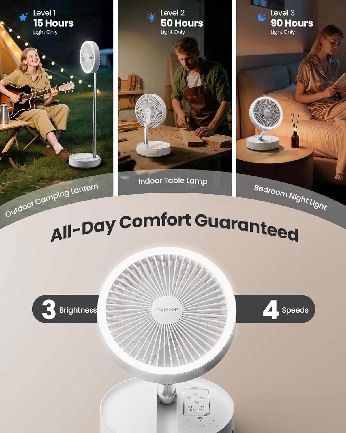 Flexible Fan with Ambient Lighting: The versatile collapsible fan comes with 3 level LED lighting function for illumination. Press the light button or use the remote to turn on the light. Strong brightness can last for 15 hours, suitable as an indoor table lamp. Medium brightness can last for 50 hours, perfect for outdoor camping lamp. Weak brightness can last for 90 hours, the best choice for a night lamp in front of your bed. Conveniently to meet your every need